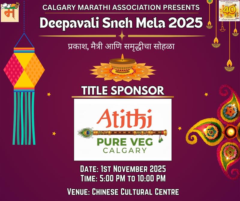 The Calgary Marathi Association is delighted to invite you and your family to join us for the Deepavali Sneh Mela 2025, Powered by Atithi Pure Veg, a grand celebration of the festival of lights, bringing our community together in joy, unity, and cultural richness.